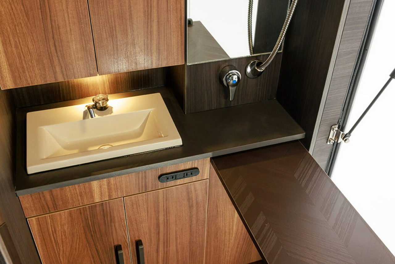 Once you’re done eating inside the cabin, the dining area can be converted into a double bed that can accommodate adults. There’s also a fold-out bed above the vehicle’s cabin in case you have additional guests or children on your camping trip. In case it gets a bit hot, there’s a built-in air-conditioning system to keep the occupants cool at even the hottest of summers, and can be controlled via a touchscreen panel.