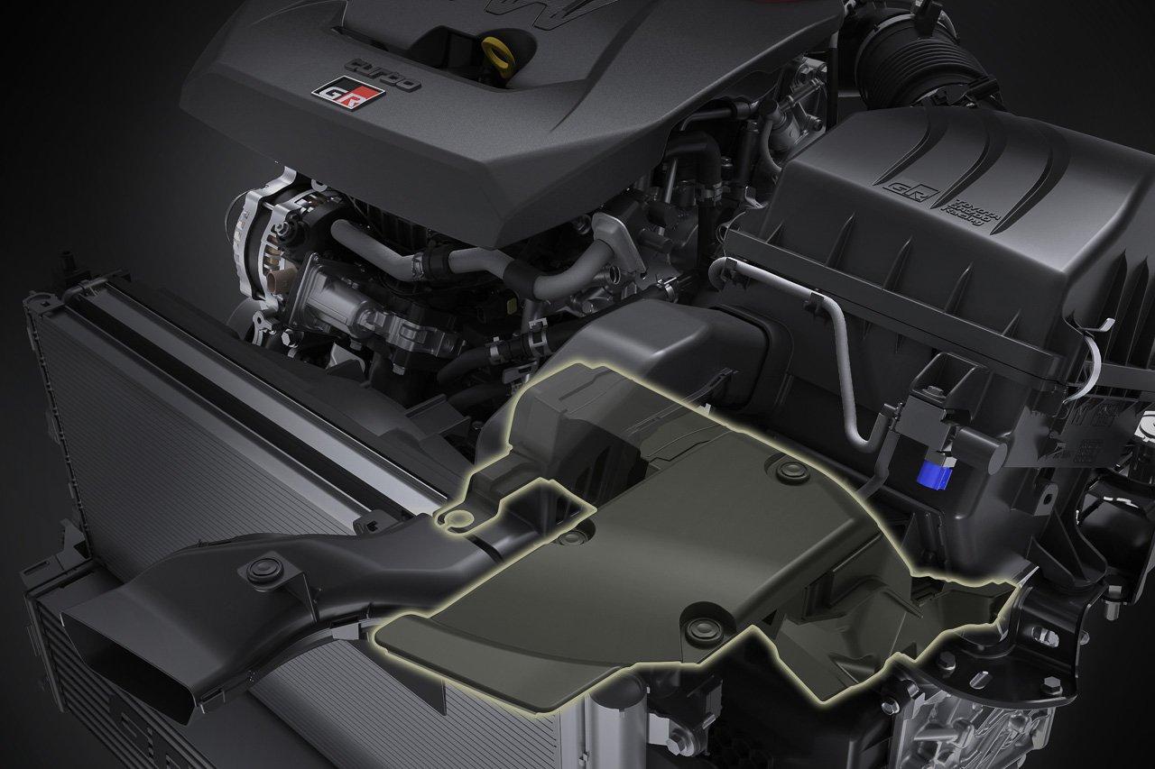 Next, Toyota installed a cool air duct for the 1.6L turbocharged three-cylinder that pushes out 300 PS and 400 Nm of torque. According to the automaker, the cool air duct is there to maintain stable high engine output even when the engine bay temperature rises during full-throttle driving. The cool air duct activates during high engine speeds and has been added to the secondary intake duct (below the air cleaner).
