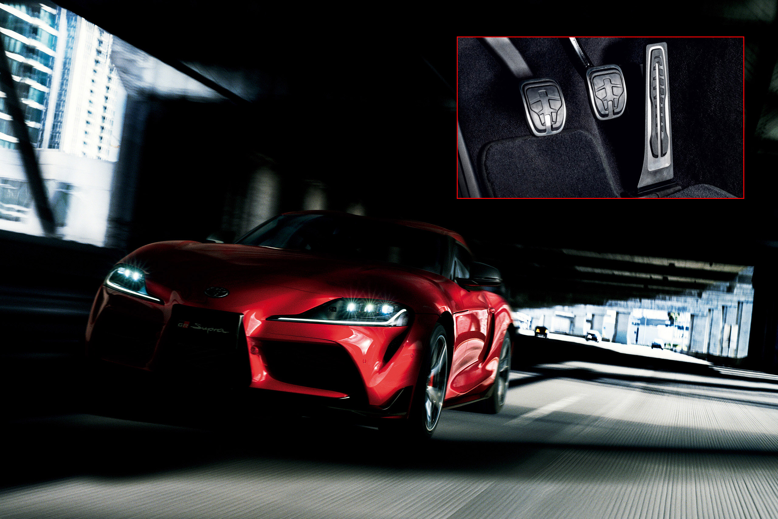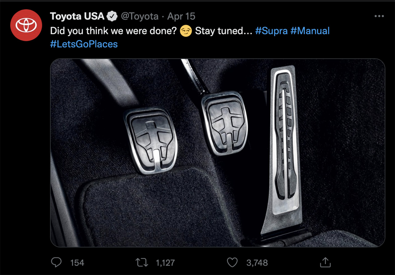 A three-pedal teaser was Tweeted by Toyota USA with the hashtags #Supra and #Manual, which was followed by an official release by Toyota UK and Toyota EU.