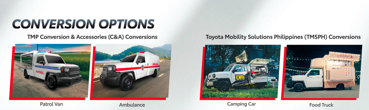 Seeing this conundrum, TMP is also offering unique conversions for the Tamaraw. Depending on the specific purpose the vehicle will take, Toyota is offering several conversion options under TMP Conversion & Accessories (TMPCA) and Toyota Mobility Solutions Philippines (TMSPH).