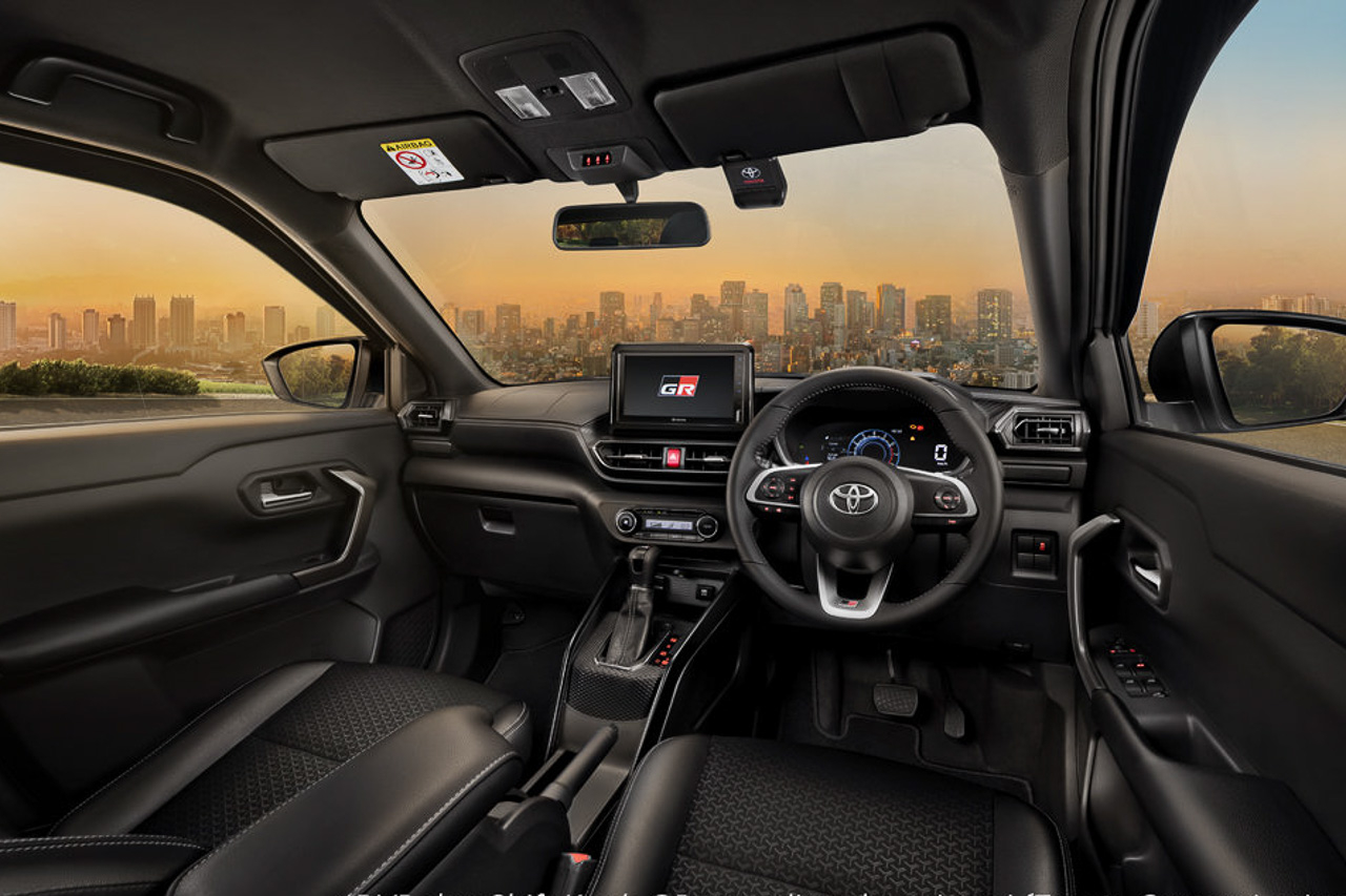 Open the doors, and the Raize GR Sport gets a new black interior, complete with a leather armrest, leather-fabric seats, and contrast stitching to give the cabin a sportier appearance. There's also a new 9-inch touchscreen infotainment system that supports Android Auto & Apple CarPlay, a leather-wrapped GR steering wheel, and paddle shifters, which were also derived from the Turbo variant.