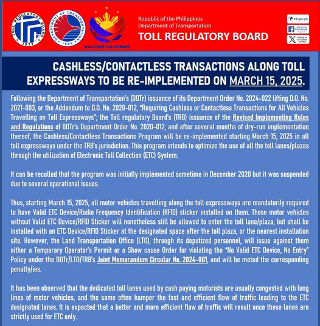 Fast forward to 2025, the TRB has announced that cashless/contactless toll collection will be fully reimplemented on March 15. This comes after the DOTr's issuance of Department Order No. 2024-022 which lifted D.O. No. 2021-003, or the Addendum to D.O. No. 2020-012, “Requiring Cashless or Contactless Transactions for All Vehicles Travelling on Toll Expressways”.