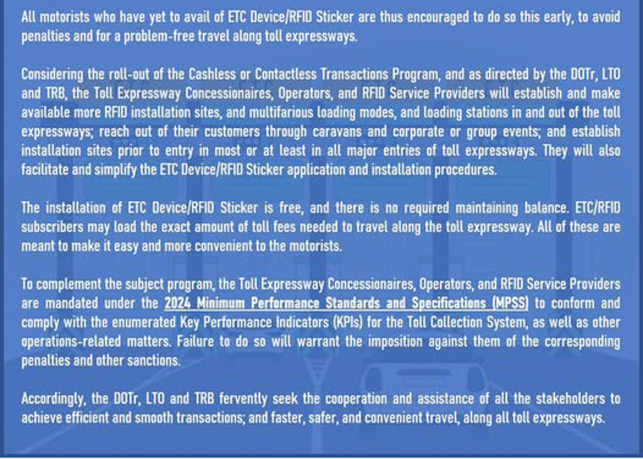 The DOTr, LTO, and TRB seek the cooperation and assistance of all the stakeholders to achieve efficient and smooth transactions; and faster, safer, and convenient travel, along all toll expressways.