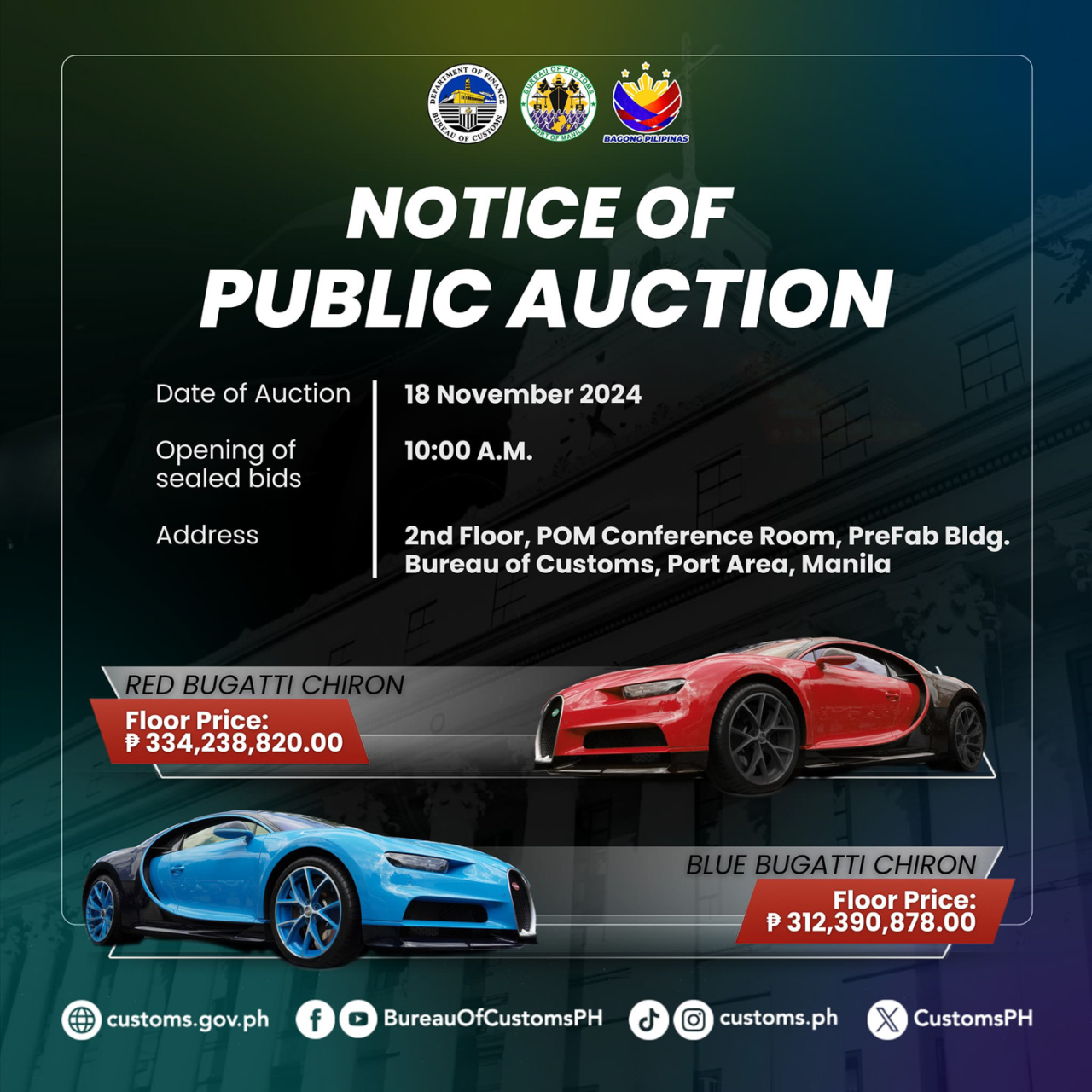 Apart from that, you also have to prove you’re indeed a big spender, as the bid requires a bond of PHP 15,619,543.90 for the blue Chiron, and PHP 16,711,941.00. These will be refunded to the losing bidders after the auction closes.