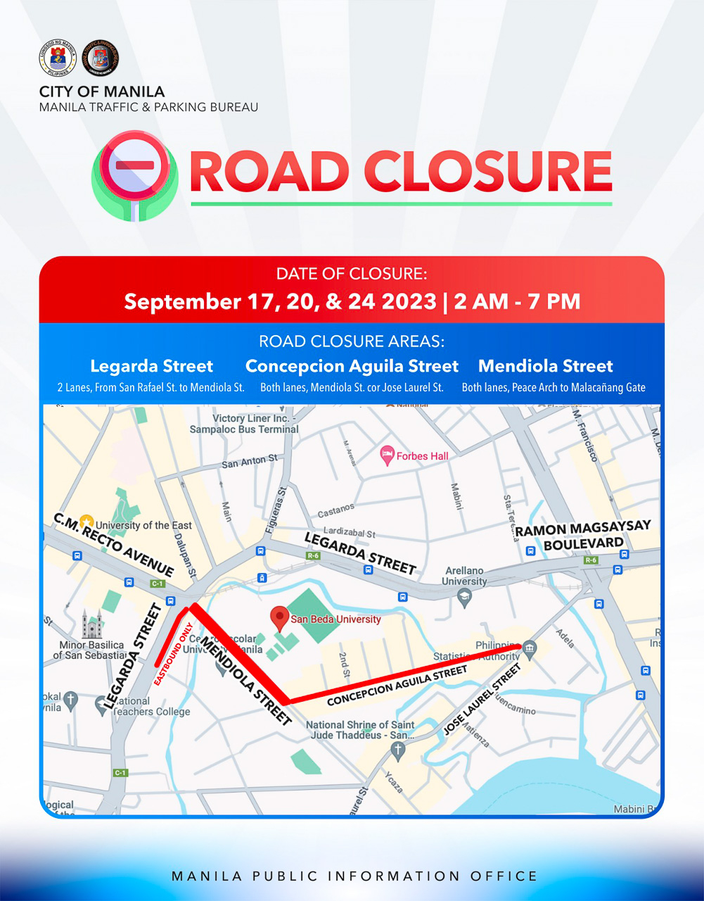 City of Manila to close on streets around UST and San Beda on September 17, 20, and 24