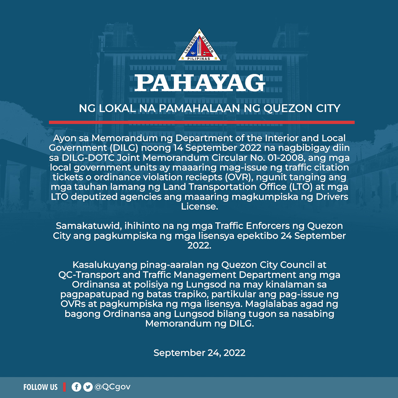 [Therefore, Quezon City traffic enforcers will stop confiscating licenses effective September 24, 2022]