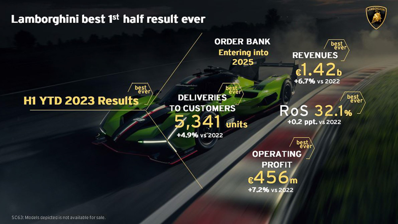 “We have achieved yet another record half-year for our company, and take great pride once again in communicating the results. We are really excited about these numbers, delivered with only two models in the range in a year that we can define as special for Lamborghini. In fact, 2023, in addition to marking the company’s 60th anniversary, has seen the launch of the Revuelto, the first plug-in hybrid in our history, and the presentation of the SC63, the most advanced racing car ever designed by Lamborghini that follows the company’s Direzione Cor Tauri strategy for electrifying the range,” said Stephan Winkelmann, Chairman and CEO of Automobili Lamborghini.