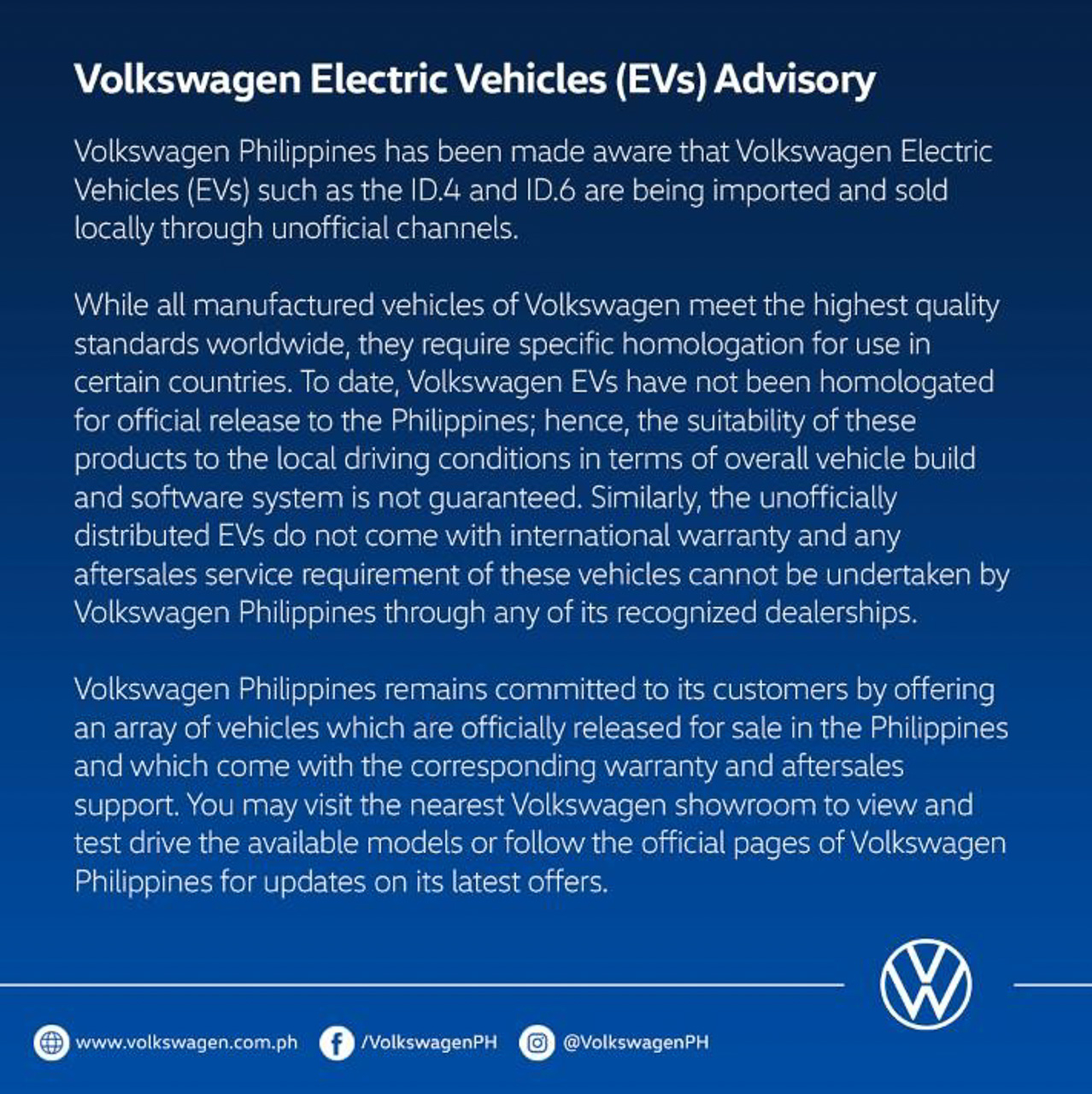 The company released a statement saying they are aware that vehicles such as the ID.4 and ID.6 are already being sold locally. While Volkswagen vehicles (including the EVs) are built to global standards, Volkswagen Philippines said that the ID.4 and ID.6 are not yet homologated for official release in the country.