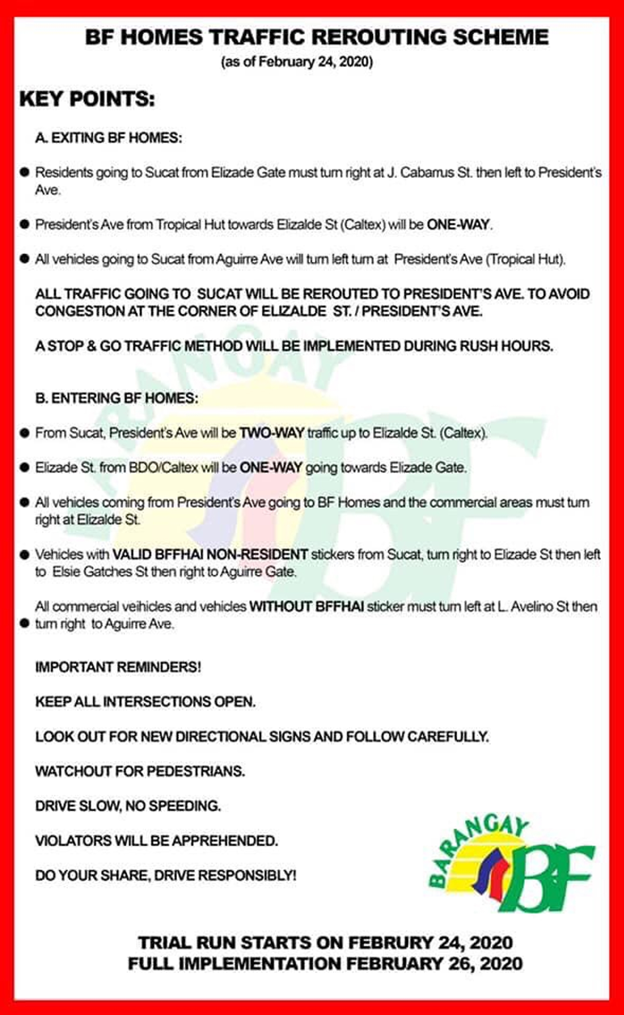 Trial run of the new traffic scheme inside BF Homes Paranque starts today, February 24, 2020. Full implementation will begin on February 26.
