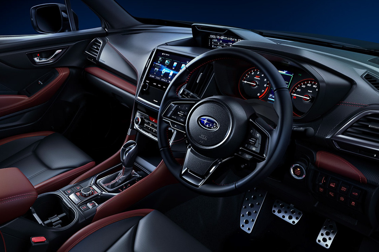 Moving inside, the crossover greets passengers with Bordeaux and Nappa leather upholstery. It also comes with red contrast stitching on the steering wheel, dashboard, door panels, and even on the center console. As an extra touch, the instrument panel comes with STI Sport gauges that remind owners they are in something special.