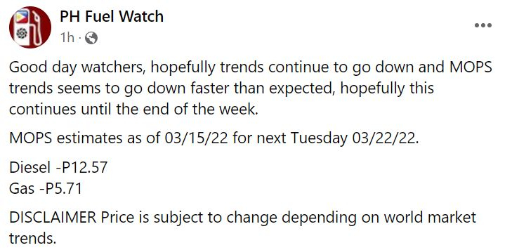 PH Fuel Watch base their information on Mean of Platts Singapore (MOPS), which gives a price forecast of oil products based in Singapore that is 15 to 30 days ahead. Their latest post is finally singing a different tune for next week. Check the screenshot below :