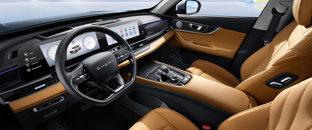 Tan leather seats are available in the Tiggo 8 Pro along with neat touches of high gloss piano black accents. A flat bottom leather-wrapped steering wheel is also available as well as a panoramic sunroof. Other key features available inside the 2025 Tiggo 8 Pro include a wireless charging pad, Wi-Fi hotspot, power-adjustable front seats, front & rear center armrests, an 8-speaker sound system, intelligent voice control, and smart keyless entry.