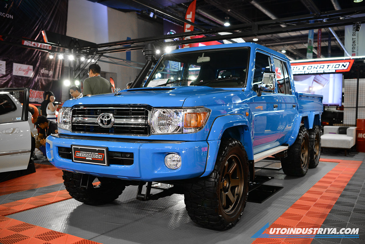 Something you don't see every day on the streets, this 6-wheeler Toyota pickup from Rebstoration features a flawless, custom blue paint job with the familiar ultra-large, PCD TE-37 wheels by Rays with matching off-road tires. Now that's how a custom pickup should be done.