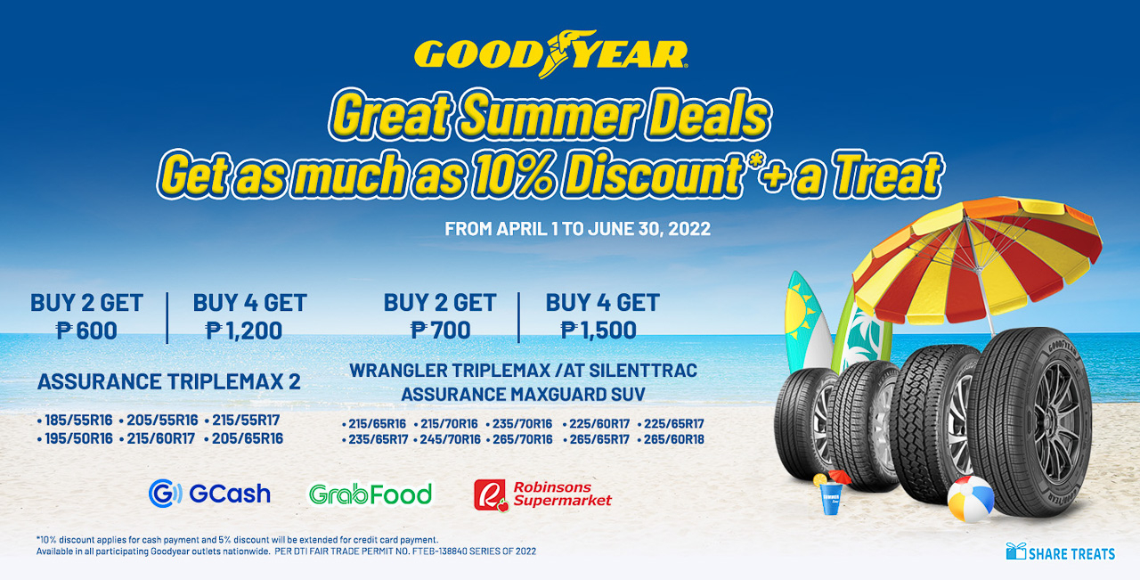 For every purchase of any eligible pattern of Goodyear tires, customers will get a price discount and Share Treats. For example, when you buy two (2) Goodyear Assurance MaxGuard SUV tires, you get a PHP 700 Share Treat. Buy four (4), and the bonus goes up to PHP 1,500.