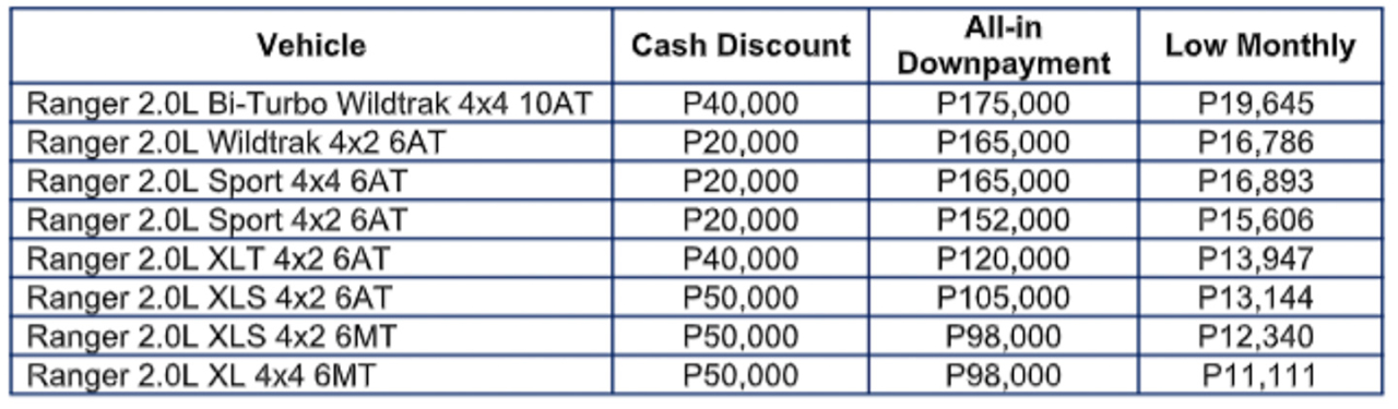 Customers can get as much as PHP 50,000 cash discount with a purchase of a Ford Ranger. They can also avail of an all-in low downpayment of PHP 98,000 or a low monthly payment of PHP 11,111.