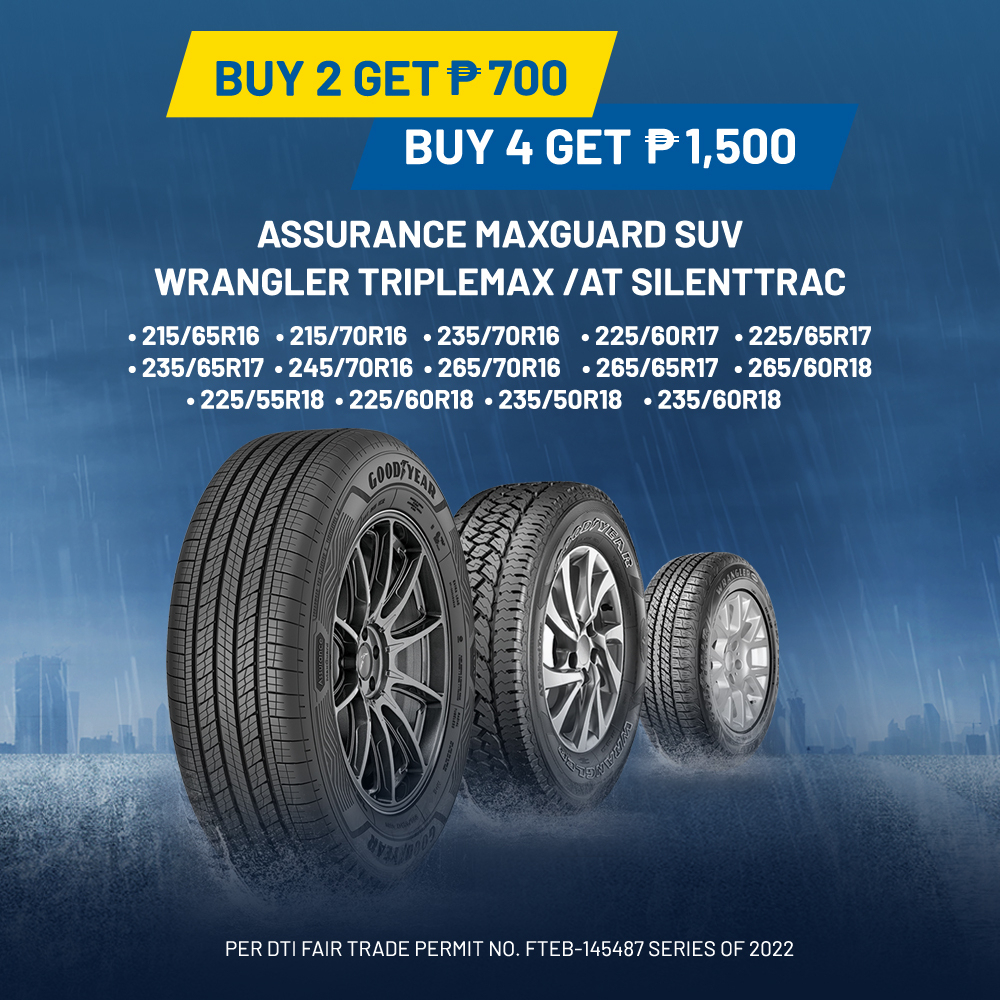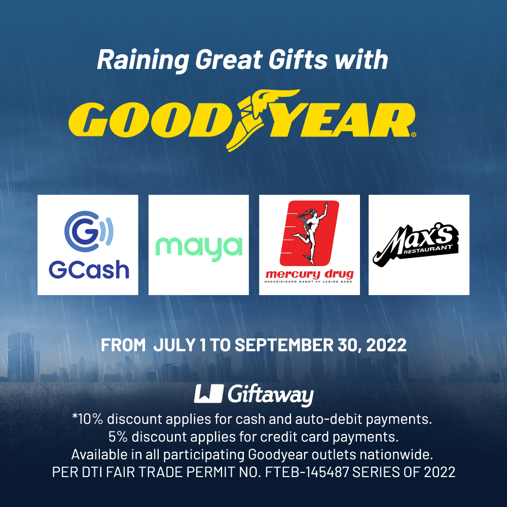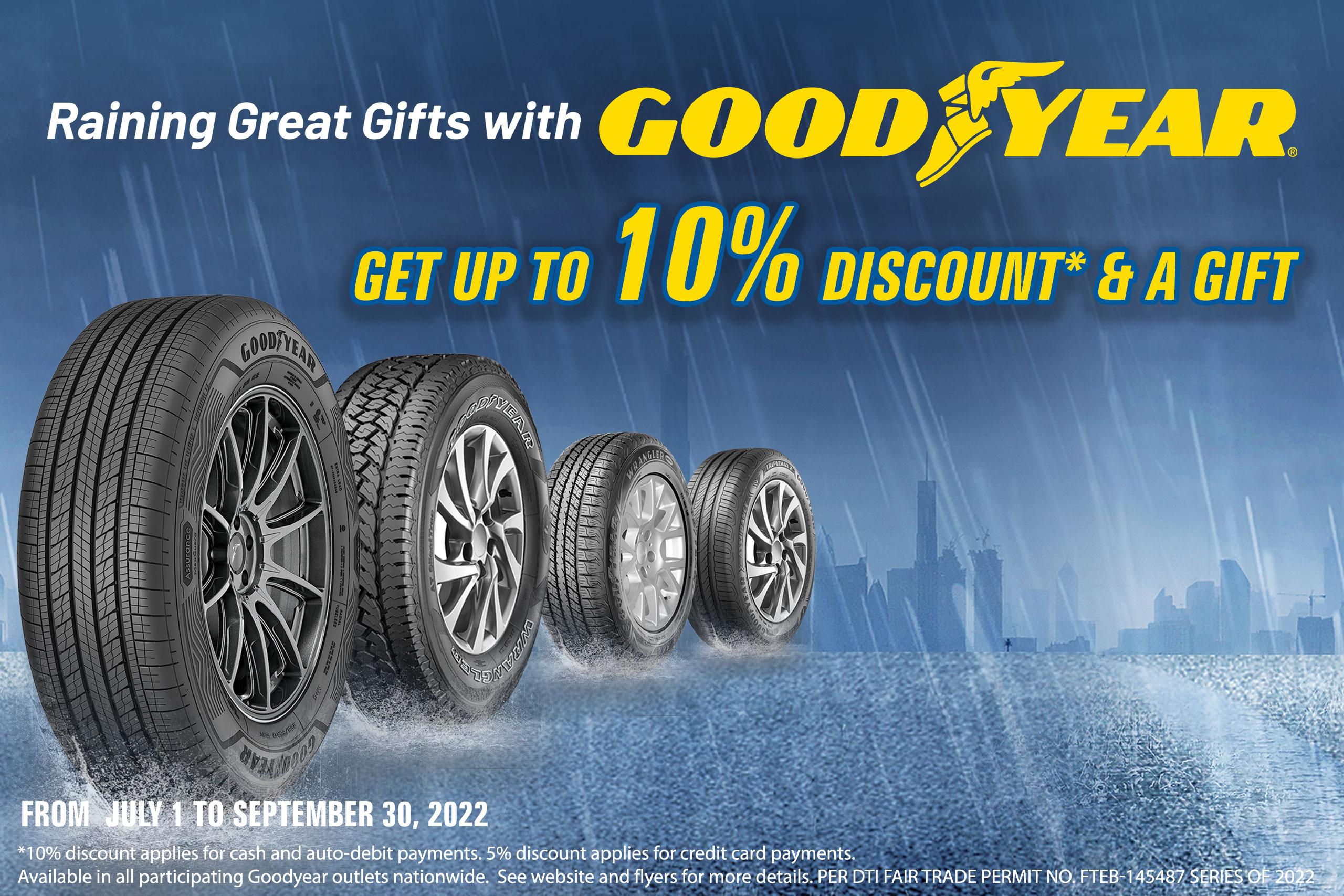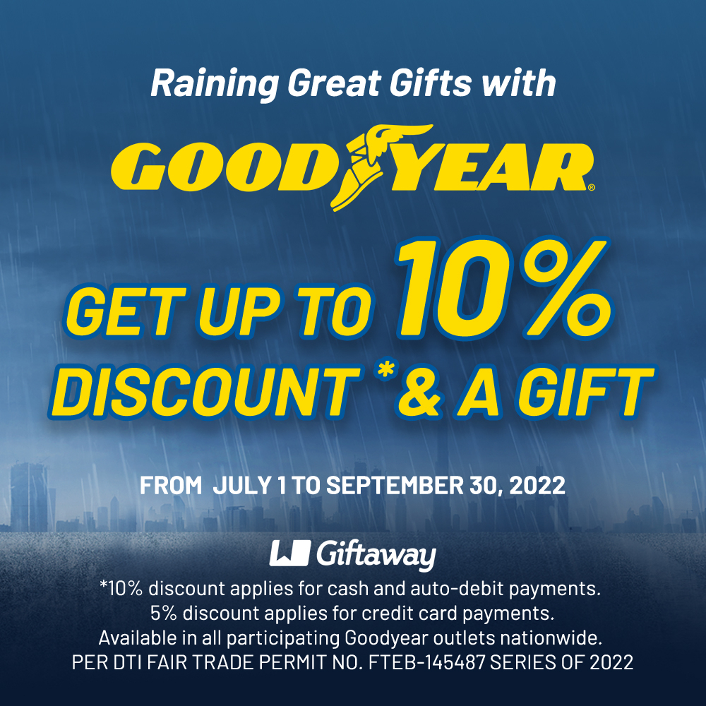 With Goodyear's Raining Great Gifts promo, driving during rainy days has never been more worry-free! Get as much as 10% off when you purchase at least two tires at participating Goodyear Autocare stores from July 1 to September 30, 2022.