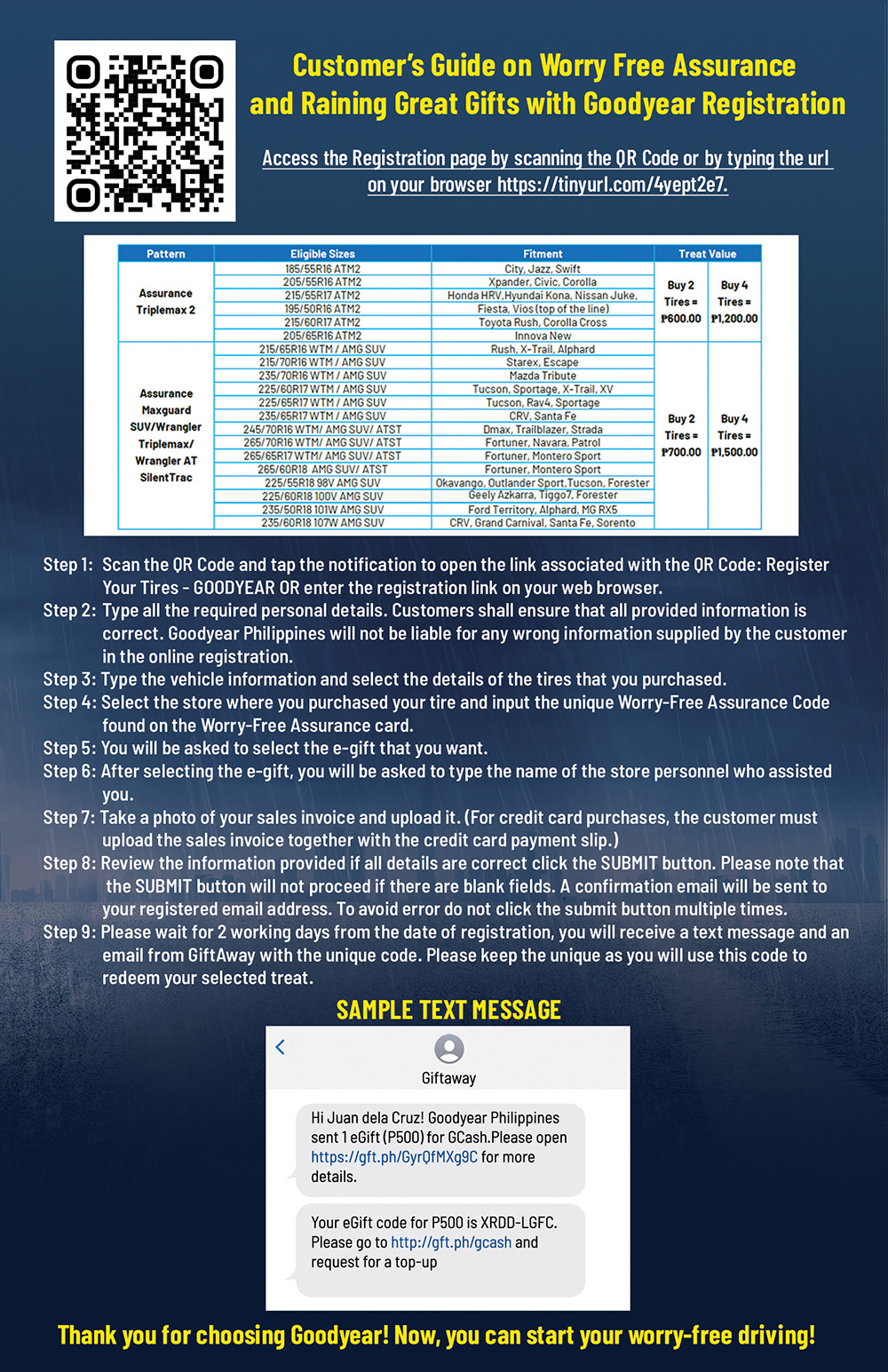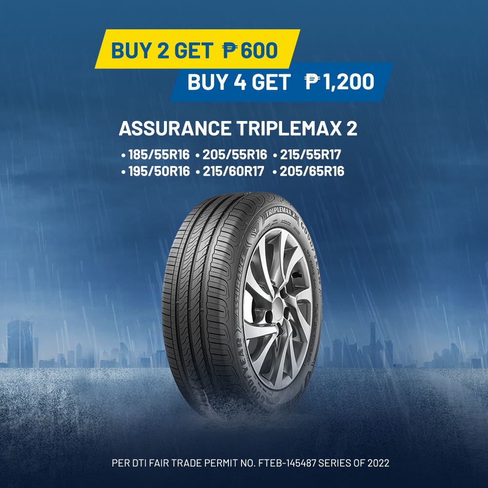 For every purchase of any eligible pattern of Goodyear tires, customers will get a price discount and an e-gift via GiftAway. For example, when you buy two (2) Goodyear Assurance Triplemax tires, you get a PHP 600 e-Gift. Buy four (4), and the bonus goes up to PHP 1,200.
