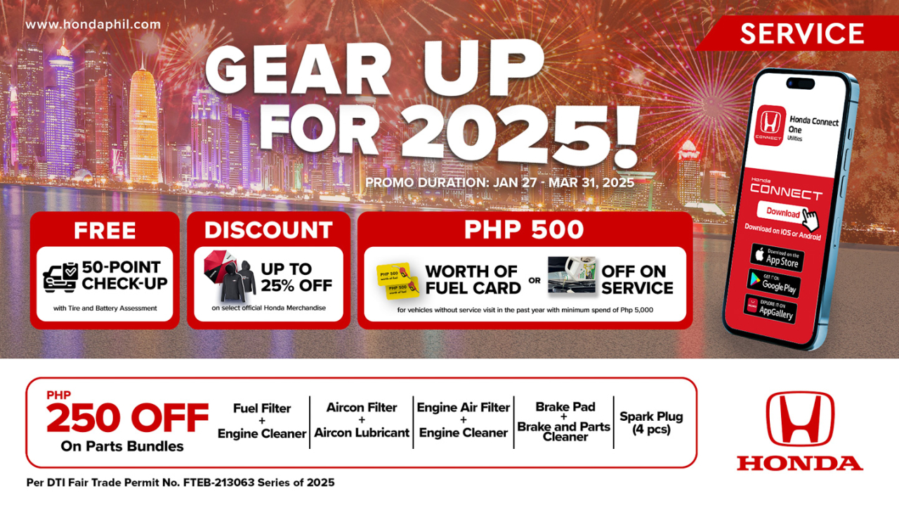Honda Cars Philippines, Inc. (HCPI) is offering its Gear Up for 2025 promo to get vehicles ready for the year ahead. All Honda Connect app users are entitled to various offers and freebies until March 31, 2025.