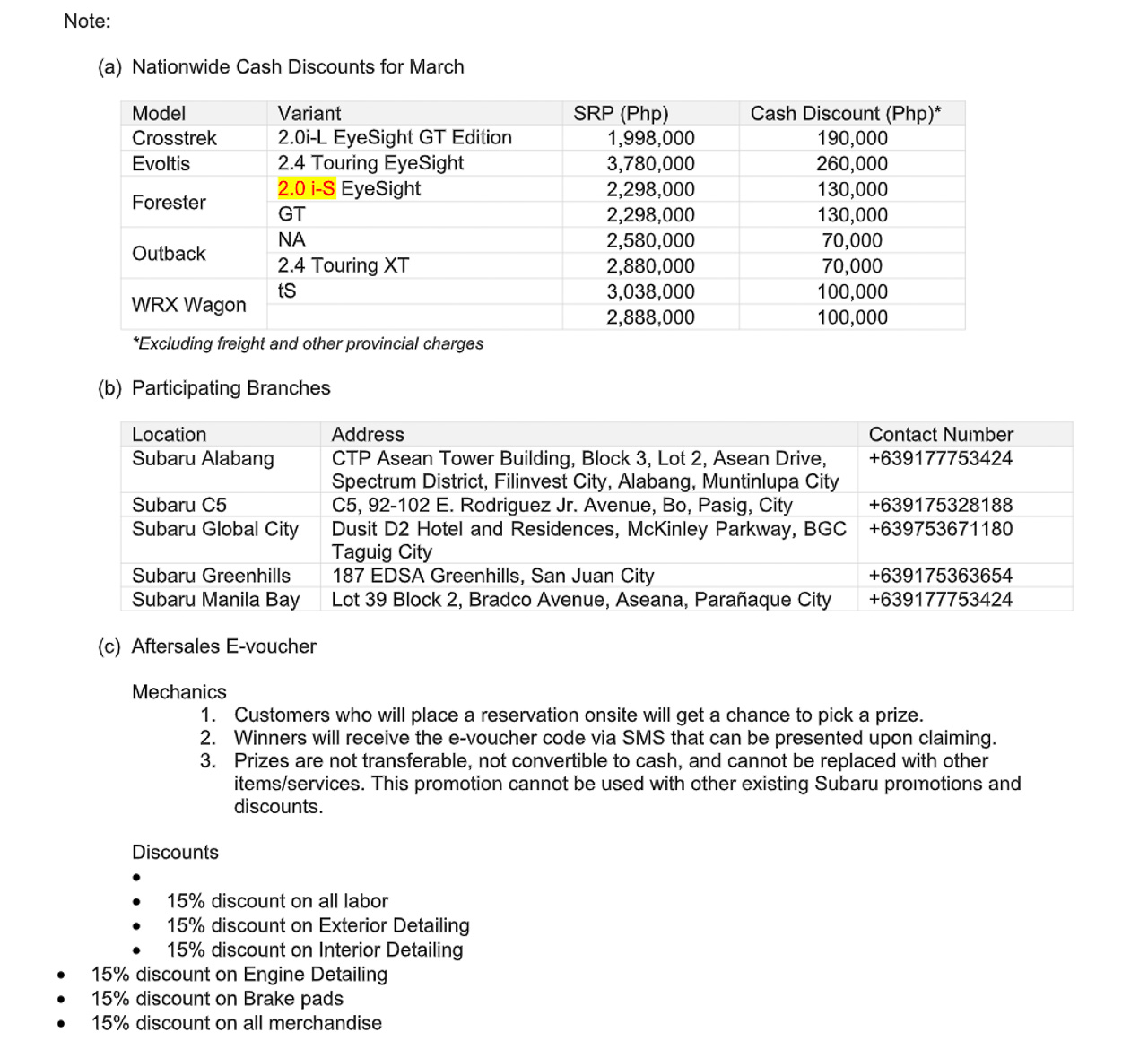 Subaru PH offering up to PHP 260K in discounts until March 23