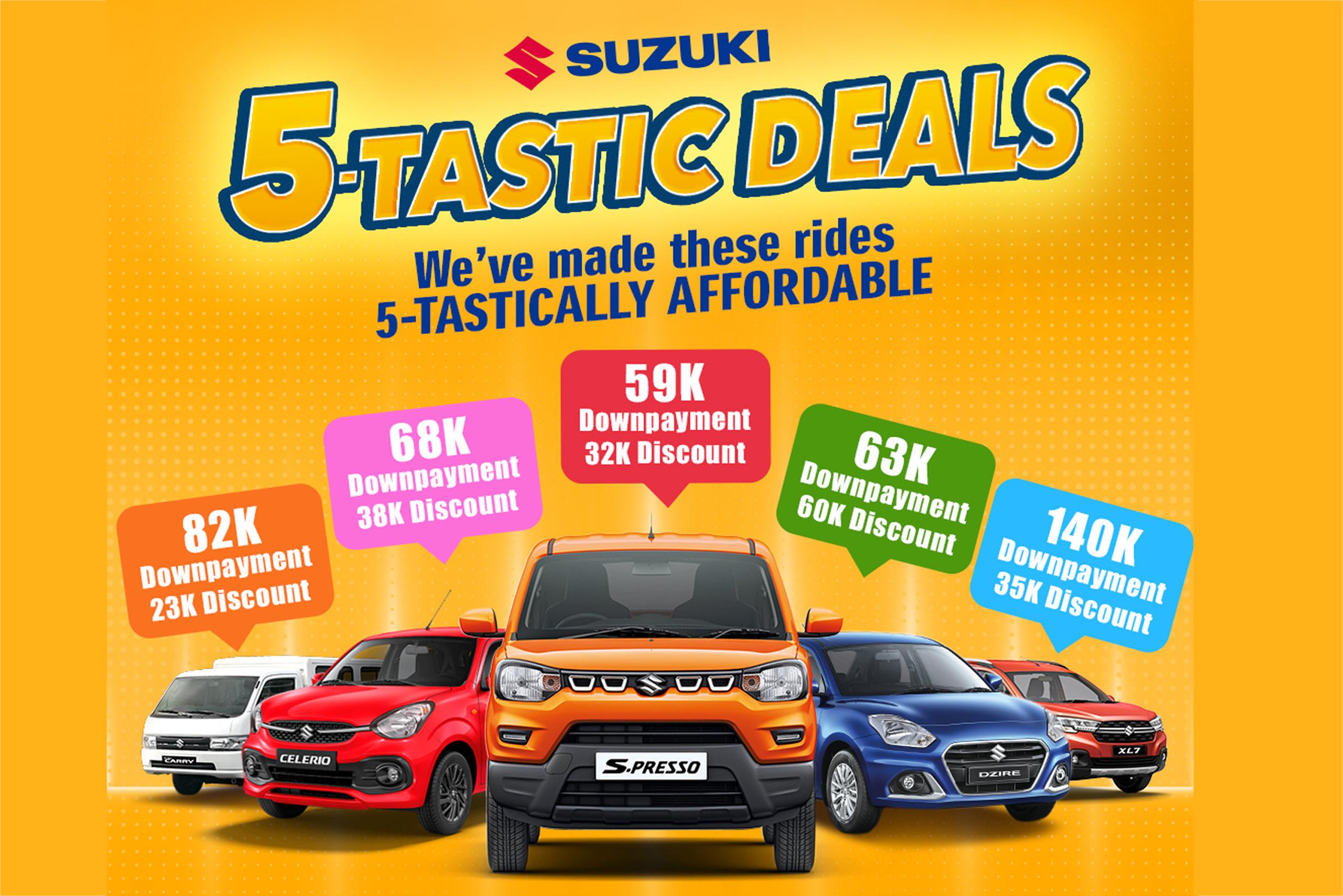 Suzuki's 5-tastic deals offer low downpayment options and cash discounts for the XL7, Carry, Dzire, S-Presso and the all-new Celerio.