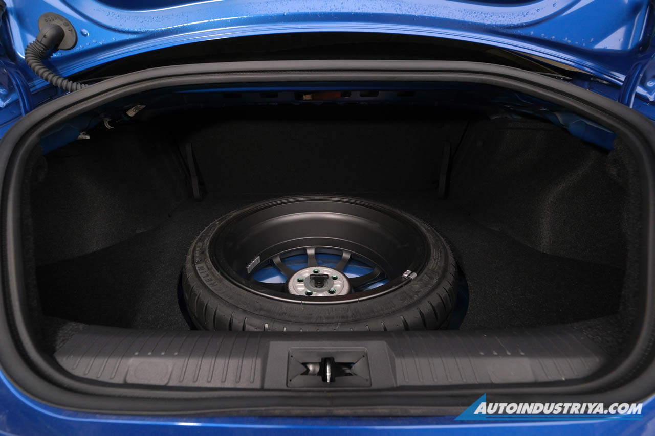 The rear seats can also fold down to expand the trunk space which is nice, if not necessary. Like before, the full-size spare really limits the trunk of the BRZ. They don't even try to cover it; instead, there's a cutout to let the spare through. It's good enough for some groceries or maybe a few rather slim bags for a weekend away, but that's about it.