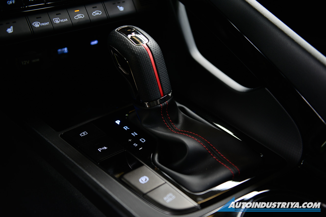 Once you step inside, the Elantra N Line’s interior gets standard issue stuff for models getting the sporty treatment, such as red stitching, a black-themed interior, thicker bolstered seats, aluminum pedals, special floor mats, you know, the usual, on top of the additional N-branded bits in the steering wheel and the shifter.
