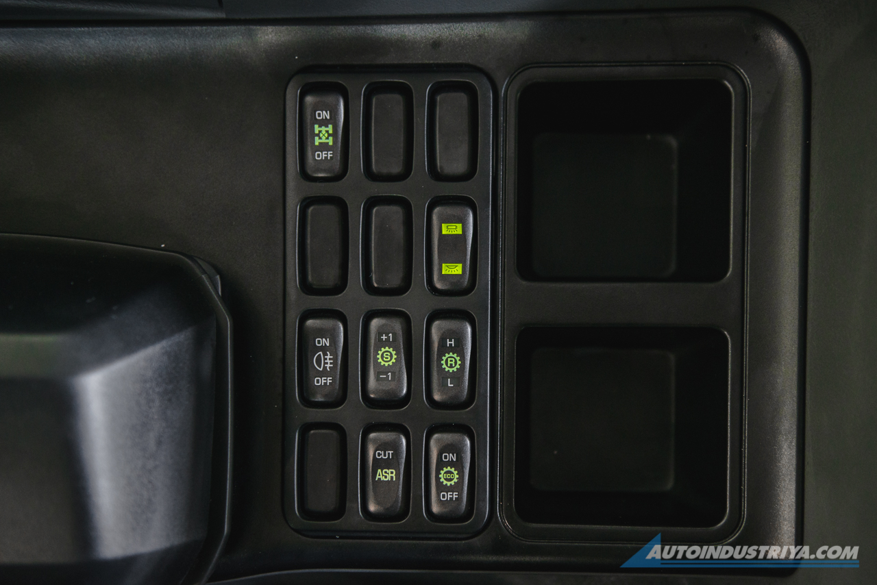 There are switches that activate the various kinds of illumination, including a retrofitted toggle for the rear work lights. You have a headlamp leveling knob, a panel to activate cruise control (yes, this has it), a switch for the anti-slip regulation system, a switch to lock the rear wheels, a knob to adjust the idle speed, and even switches that adjust the gear the Super Great will start with. It even has a switch to select high and low range for reverse, both of which depend on the load.