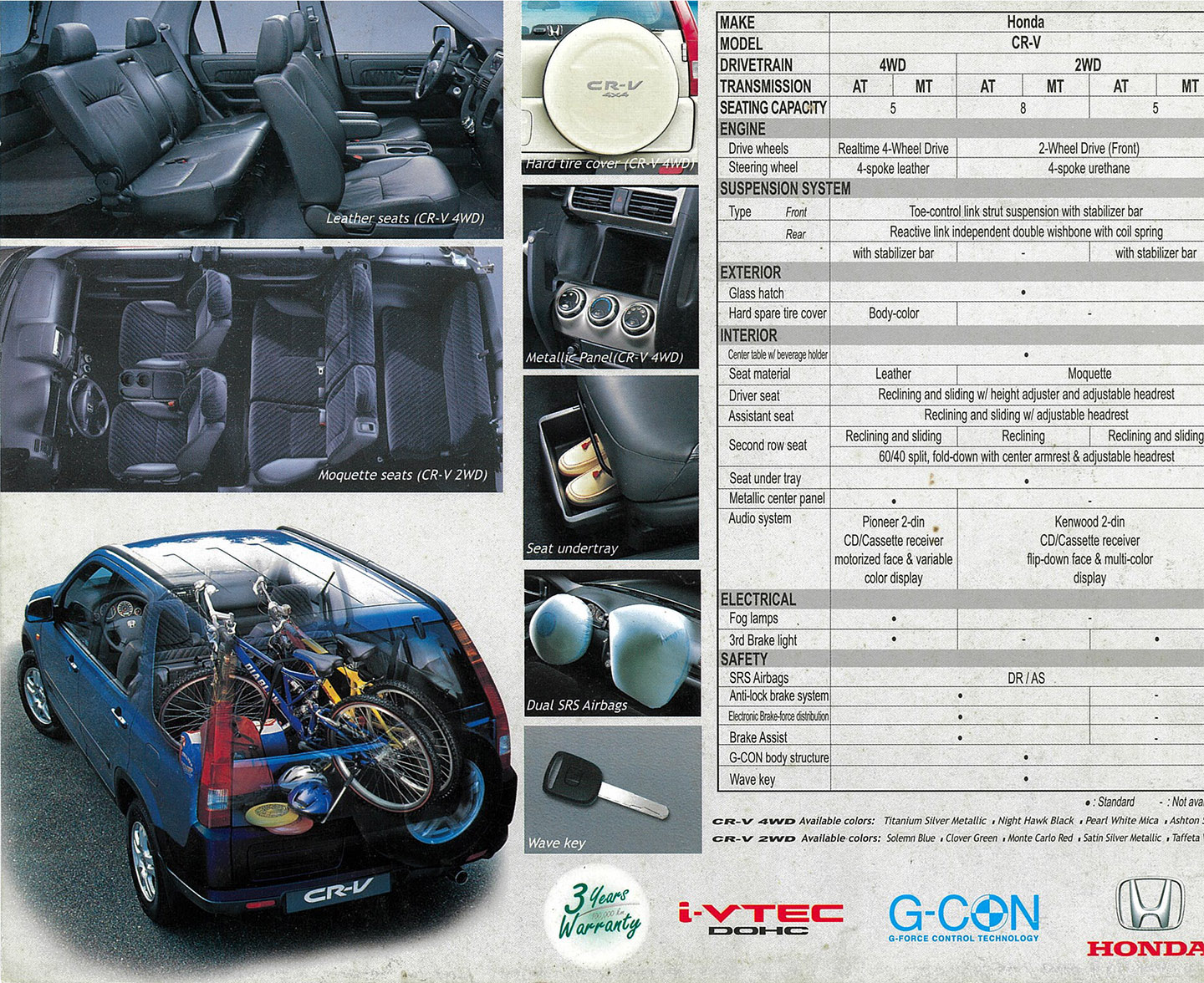 There were two variants: the base model was the CR-V 2.0L 5-speed M/T, while the other variant was the CR-V 2.0L 4-speed AT. Both models had the K20A4 with 158 horsepower and were front-wheel drive only. If I remember correctly after riding in one back in 2002, the plastics were not as good, the seats were fabric (mostly), bumpers were unpainted, there weren't as many features, so on and so forth.