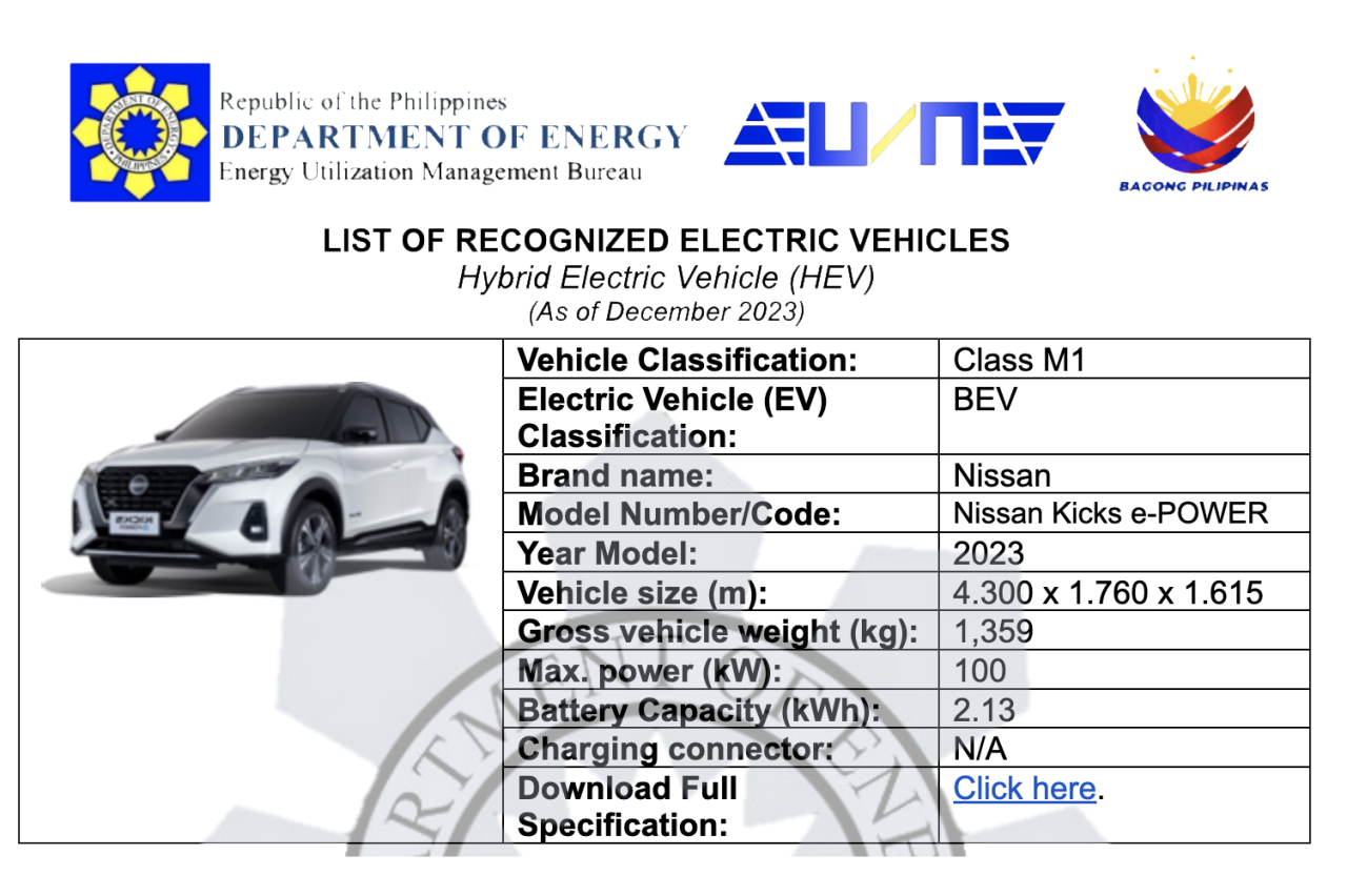 We're talking about the issue that is being brought up by the Nissan Kicks because it seems Nissan Philippines, Inc. (NPI) has just secured an official recognition from the Department of Energy (DOE). Instead of a hybrid electric vehicle (HEV), the DOE is classifying the Kicks as a battery electric vehicle (BEV) just like the Nissan Leaf.