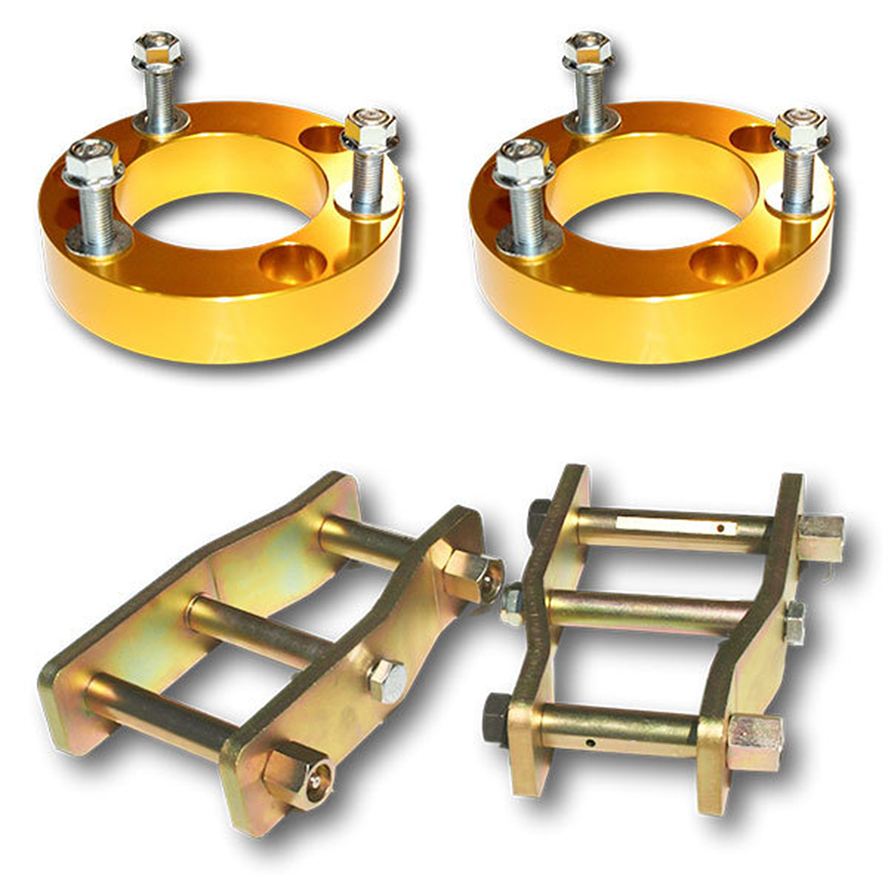 These are so-called quick lifts for SUVs and pickups with a body-on-frame chassis layout. It simply consists of front coil spring spacers with rear leaf spring shackles that instantly raise the vehicle by as much as 2 inches.