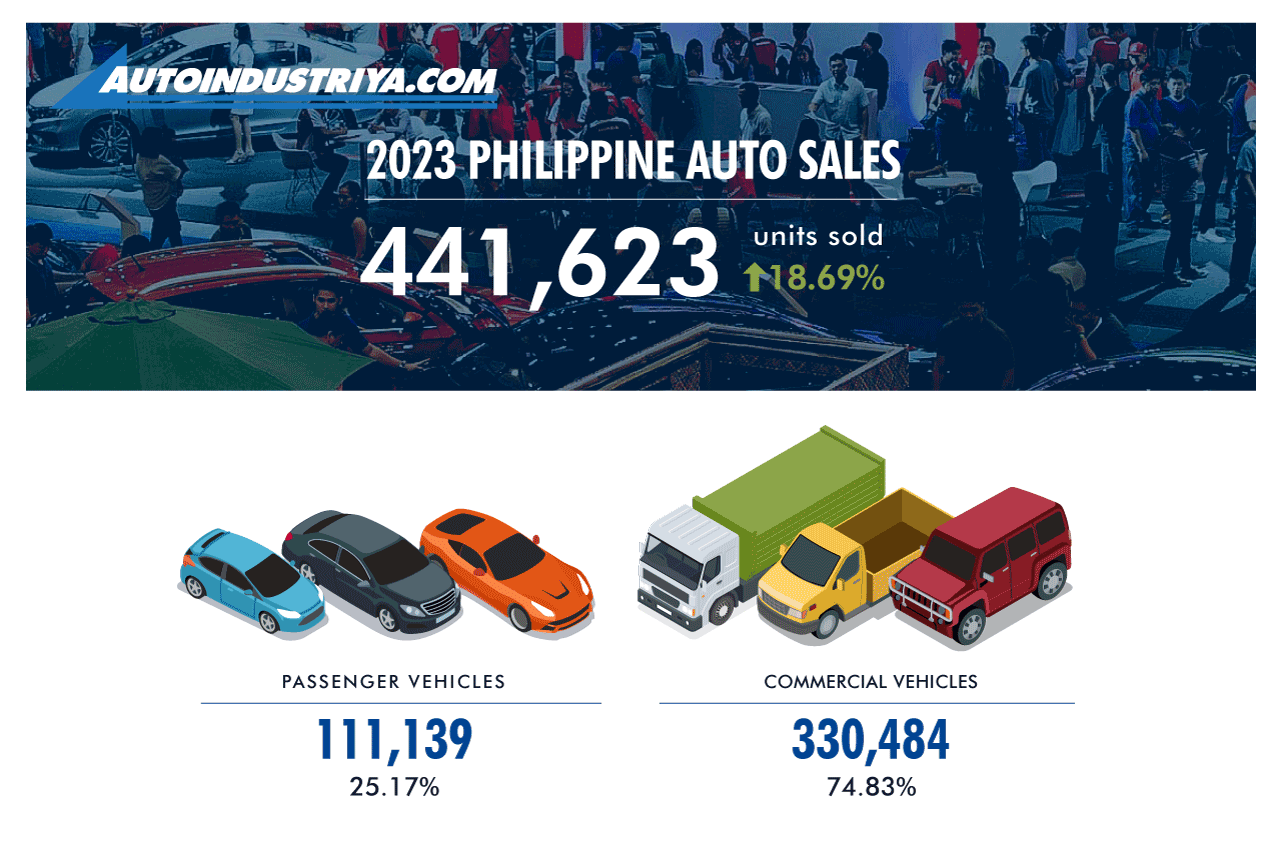 Philippine auto sales for 2023 exceeded the 423,000 unit target with an 18.69% increase year-on-year from 372,083 units to 441,623.