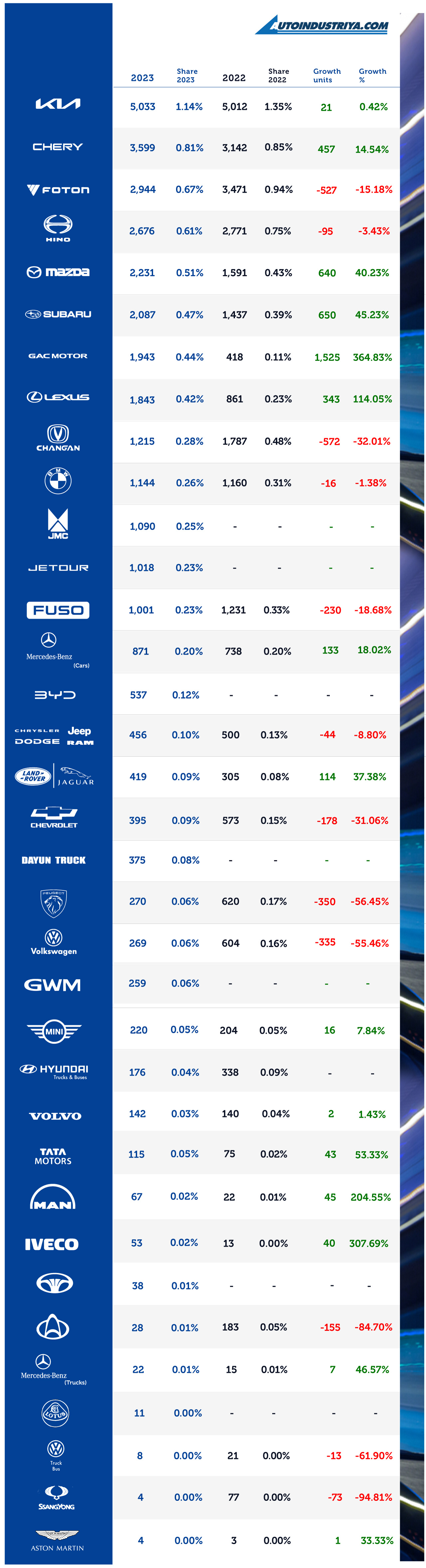 Brands making respectable debuts in the list were Jetour and JMC Trucks, both adding at least 1,000 units; Jetour's feat was achieved in only 8 months as the brand only debuted in the market in April.