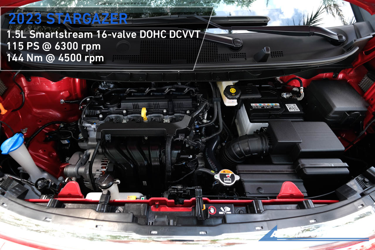 The Hyundai Stargazer is powered by a 1.5-liter Smartstream G engine which makes 115 PS at 6300 rpm along with 144 Nm of torque at 4500 rpm. Power is then sent to the front wheels via an Intelligent Variable Transmission (IVT) or a 6-speed manual transmission. The IVT is essentially Hyundai's take on a CVT and uses a chain-drive system to minimize slippage and improve fuel economy.