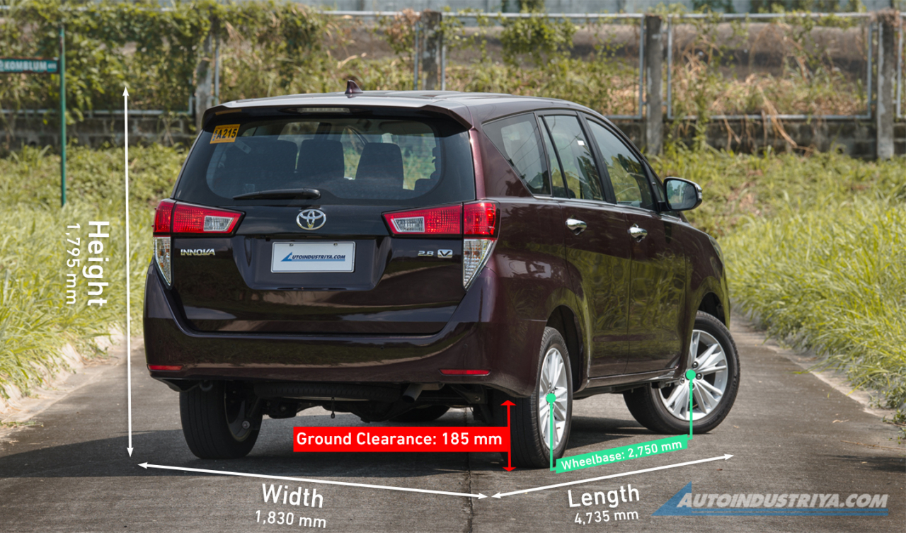 The all-new Innova measures 4755 mm long, 1850 mm wide, and 1795 mm tall. The wheelbase is now at 2850 mm, while the minimum ground clearance is measured at 185 mm.