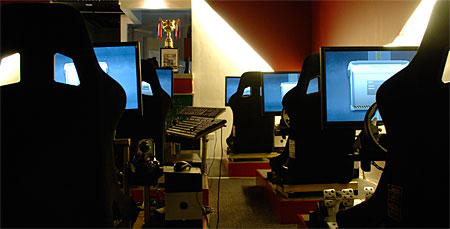 The cafe features gaming computers specced with AMD Athlon X2 processors, 3 gigabytes of ram each and HD4850 Radeons from ATI to seamlessly run the highly demanding games and the physics engines that they run. "I shopped around for different systems," Quincy continues, "and I actually wanted to use Gran Turismo as the game since it was the most popular, but as Race07 was rated as the most realistic racing game in the market then, and the PC system being more flexible for cyber-cafes, it seemed that for my concept Race07 and PC was the way to go."