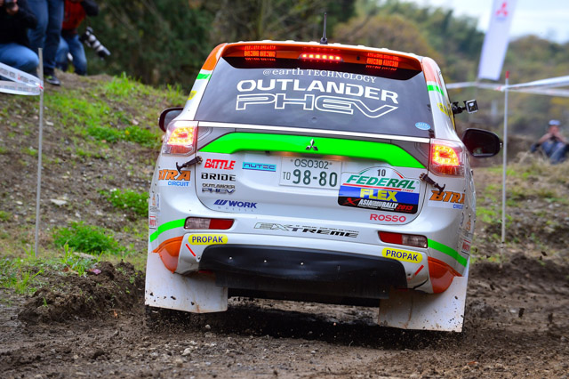 Instead of just flat dirt, Mitsubishi Motors had set up a course complete with dips, puddles and ramps that became jump points for the Outlander PHEV rally car, which has been visibly modified for cross-country rallying. Things such as the beefed up and raised suspension, the reinforcements on the undercarriage, the mud tires and the welded snorkel for the internal combustion engine that serves as a generator for the batteries and the electric motors. Like the MiEV, the Outlander PHEV can be charged from a special wall terminal.