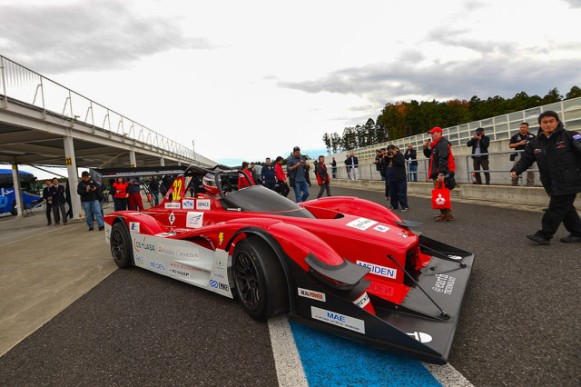 Our ears, however, cannot hear the signature sound of a race-spec internal combustion engine revving for all its worth. Instead all we hear are sounds of the air pushing the wings down to the ground, the racing slicks squealing as they reach the limit and the high pitched whine from the electric motor as the 2014 Mitsubishi MiEV Evolution III blasts past the main straight with rally master Hiroshi Masuoka at the controls.