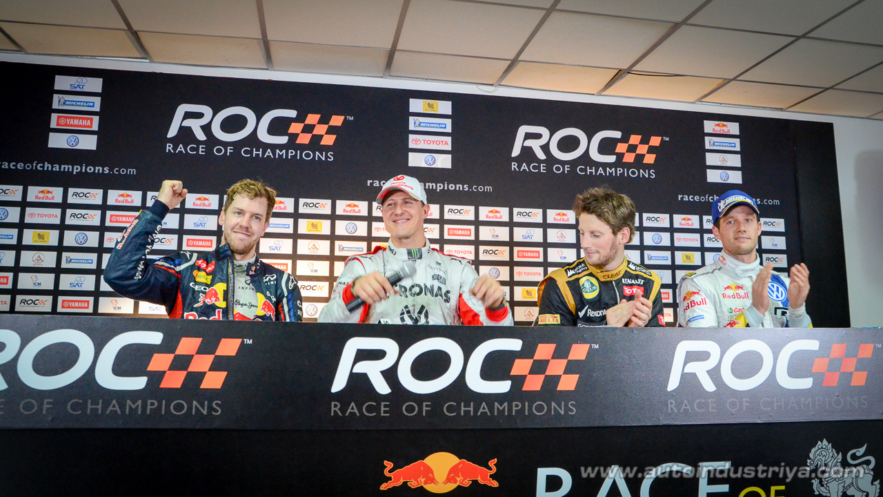This year's ROC included seven-time F1 champion Michael Schumacher, youngest triple F1 world champion Sebastian Vettel, five-time MotoGP champion Mick Doohan, eight-time LeMans 24-hour race winner Tom Kristensen, V8 Supercars Champion Jamie Whincup, Indycar Series Champion Ryan Hunter-Reay, former F1 driver David Coulthard, WTCC champion Andy Priaulx, WRC Production Champion Benito Guerra, 2012 MotoGP Champion Jorge Lorenzo, Lotus F1 driver Romain Grosjean, and 2011 Champion of Champions rally star Sebastian Ogier.