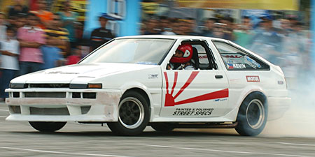 A total of 24 competitors showed up at the Greenhills Shopping Center Parking Lot for the second round of the 2008 Lateral Drift Championship. Fresh from his series opener win, Alex "X" Perez was poised to bag his second win for the season. However, Bad News stops the X on the spot in the form of Kevin "Bad News" Tayao on wet track.