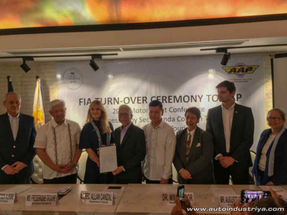 FIA Sport Conference Project Director Frederique Trouve formally turned over the hosting of the 2018 FIA Sport Conference to AAP President Gus Lagman in the presence of FIA Events Manager Martin Lalande , DOT Undersecretary Allan Canizal, and co-chairpersons of the 2018 FIA SC National Organizing Council Committee: Government Sector Chairperson/DOT Assistant Secretary Ricky Alegre, Private Sector Chairperson/AAP Trustee and Tourism and Travel Committee Chairperson Mina T. Gabor and Private Sector Co-Chairperson/AAP Trustee and Motor Sport Chairperson Mandy Eduque.