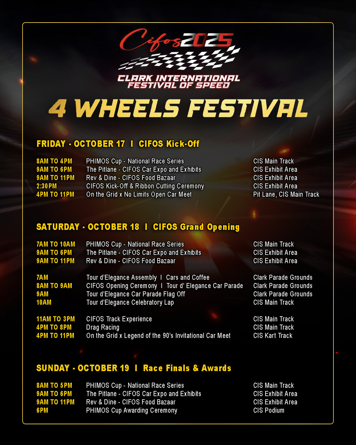 The Clark International Festival of Speed will take place from October 17 to 19, 2025. Tickets for the 2025 Clark International Festival of Speed are now available at https://tinyurl.com/2025CIFOScartix or by scanning the QR code on the official event poster.