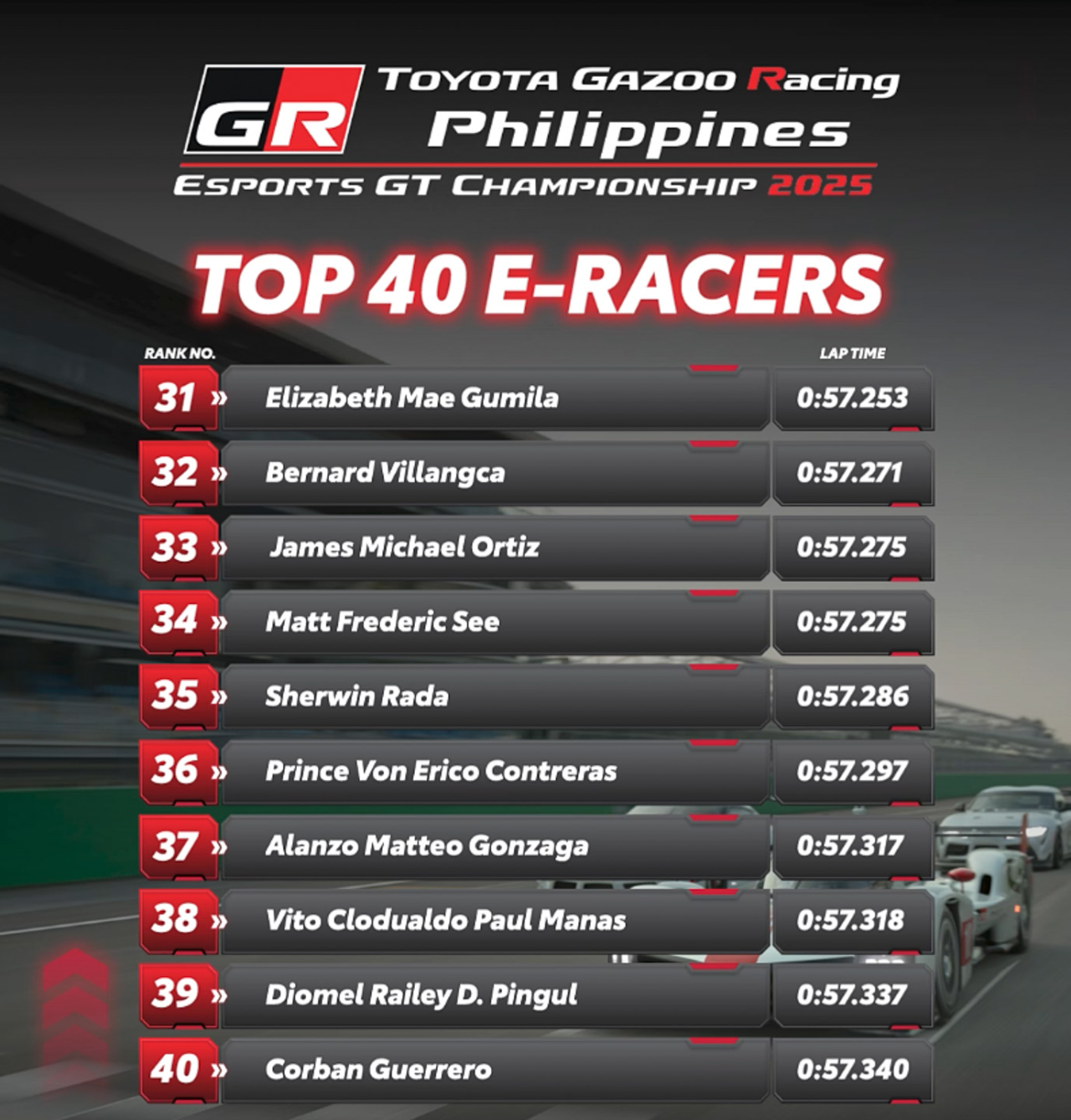 Toyota Motor Philippines (TMP) has announced the top 40 racers who will be competing in the quarterfinals of its premier sim racing tournament, the Toyota Gazoo Racing eSports GT Championship 2025.