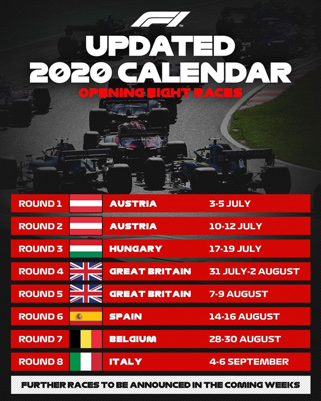 “In the past weeks, we have been working tirelessly with all our partners, the FIA, and the teams to create a revised opening 2020 calendar allowing us to restart racing in the safest possible way. We are pleased to be able to set out our opening eight-race calendar today and look forward to publishing our full calendar in the coming weeks. I want to thank every promoter and partner for their support and ongoing commitment to Formula 1,” said Chase Carey, Chairman, and CEO of Formula 1.