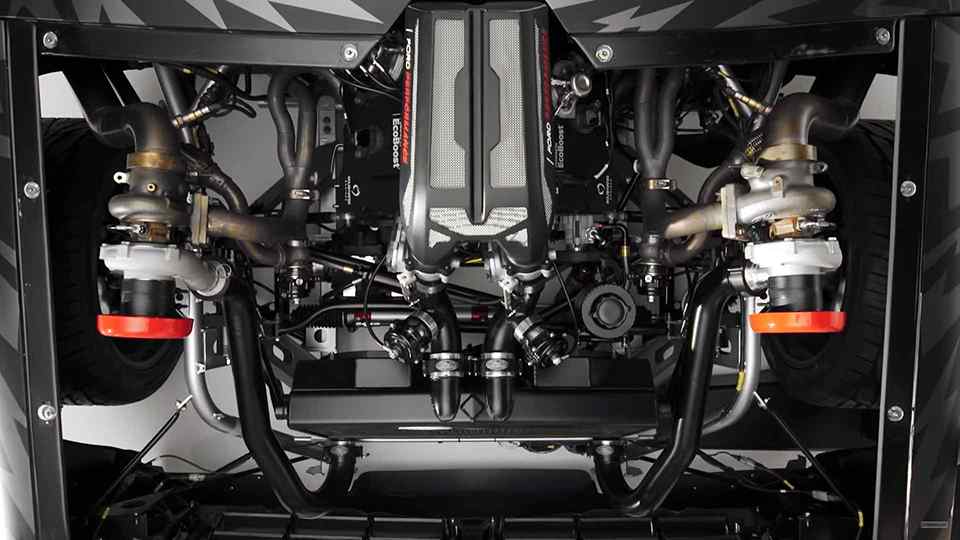 At the heart of the Hoonitruck F-150 is a 3.5-liter twin-turbo EcoBoost V6 lifted straight from the Ford GT. Custom-tuned by Ford Performance, the six-cylinder engine now cranks out over 920 PS at 7400 rpm along with 952 Nm of torque at 6450 rpm. Power is then sent to all four wheels via a Sadev six-speed sequential transmission, similar to the one used in the Hoonicorn Mustang.