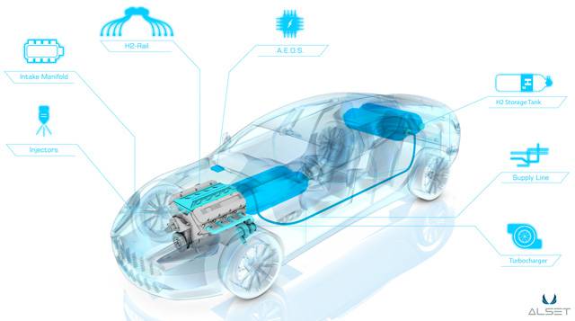 The Hybrid Hydrogen system comprises a hydrogen fuel rail, storage tanks and proprietary engine management system. This enables flexibility in the control of the combustion process according to each particular driving situation: either pure hydrogen, gasoline or a arbitrary blend of both can be selected to ensure optimum power, acceleration and CO2 reduction.
