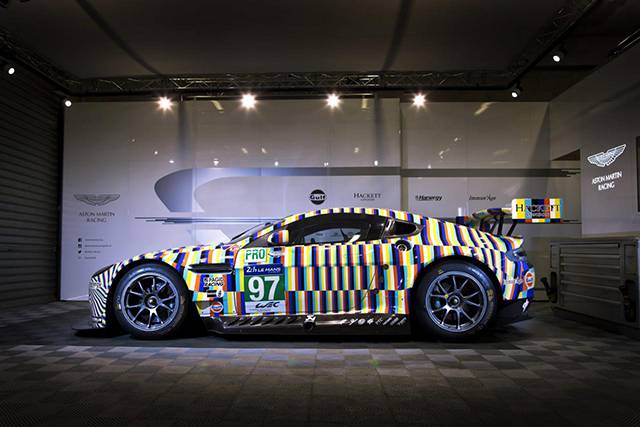 Designed by renowned German artist and illusionist Tobias Rehberger, Aston Martin Racing invited Rehberger to make a one-off livery for their race car. He stated that he used geometric shapes and patterns to give the race car the impression of movement even though it is static.