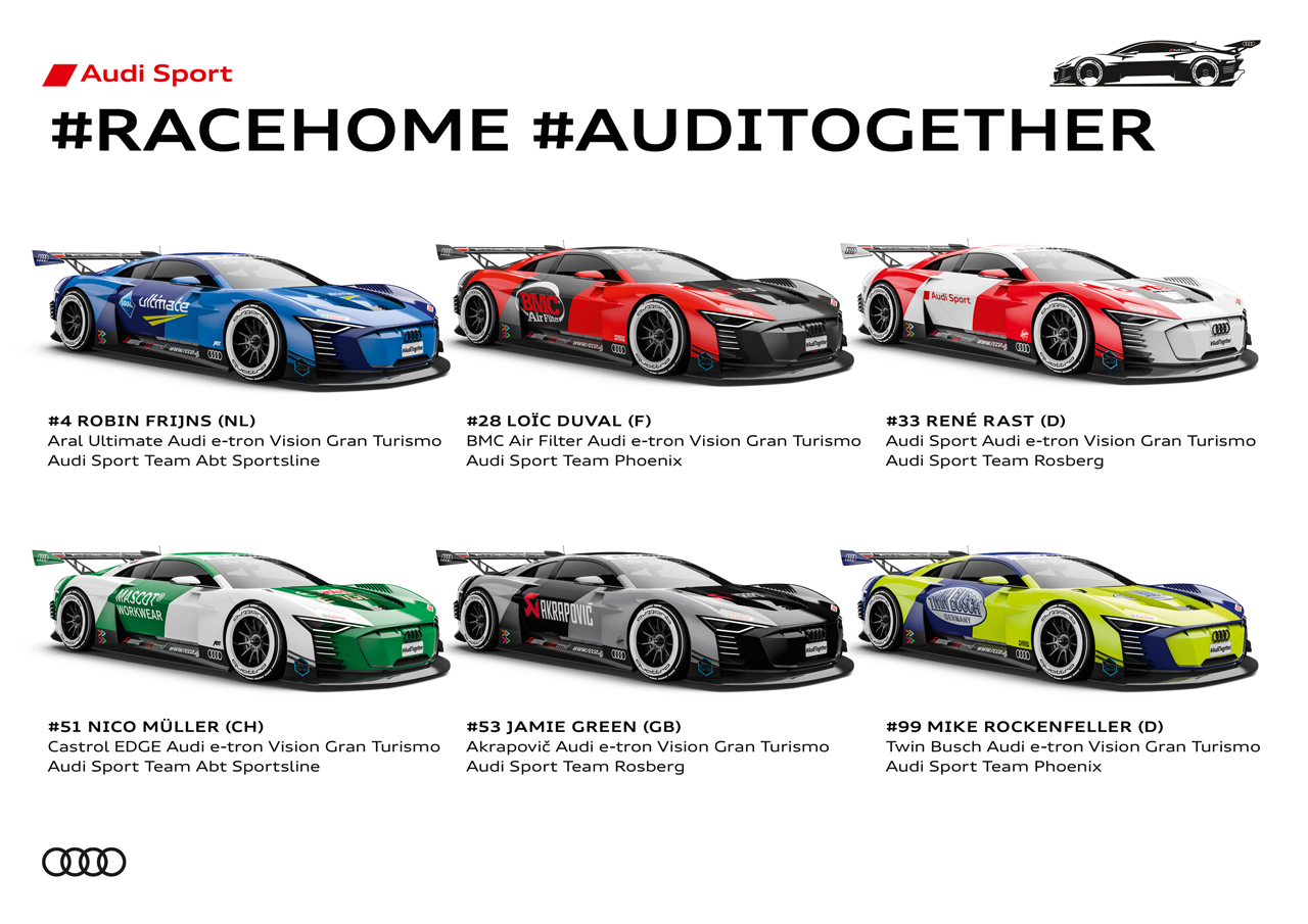 Grant Turismo Sport players around the world can have the opportunity to race against the DTM stars on #RaceHome. They may be able to get a spot on the grid each week by developing and publishing a design for the Audi e-tron Vision Gran Turismo in conjunction with #AudiTogether and #WeStayHome. The most creative design will win a spot on the grid. The judges are the six Audi DTM drivers themselves: Loïc Duval, Jamie Green, Nico Müller, Robin Frijns, René Rast and Mike Rockenfeller.