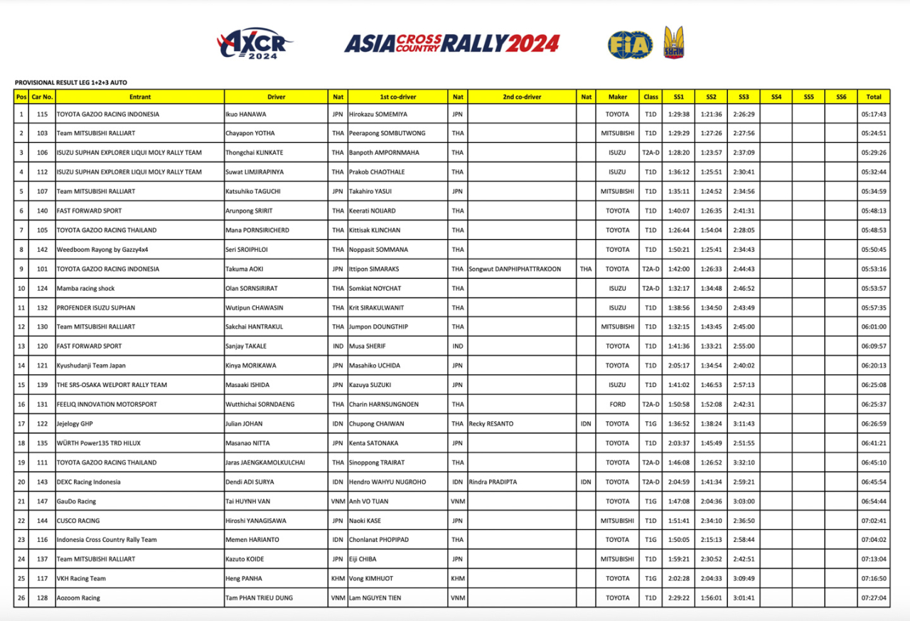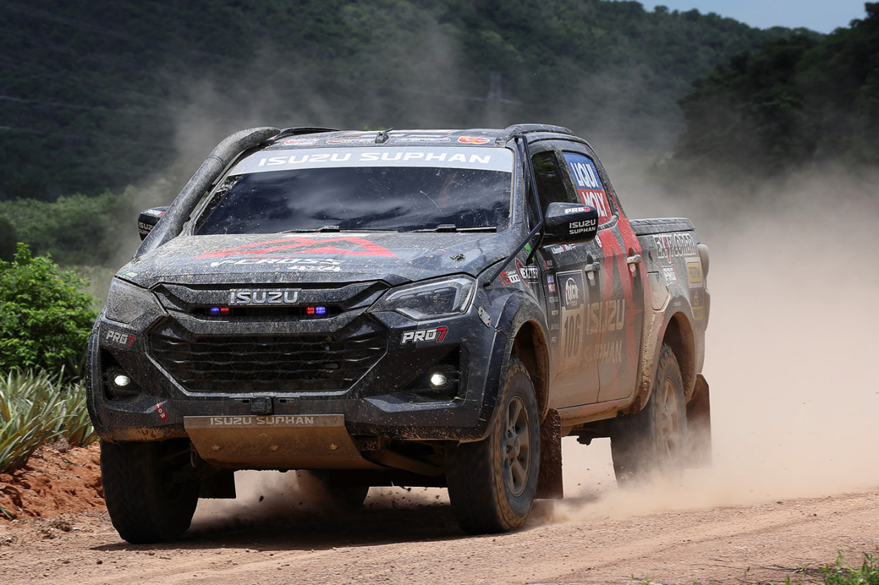 In fourth place is the T1D-classified sister D-Max of Isuzu Suphan Explorer Liqui Moly Rally Team, while the #107 Triton of Team Mitsubishi Ralliart and the #140 Hilux of Team Fast Forward Sport occupy 5th and 6th places, respectively.