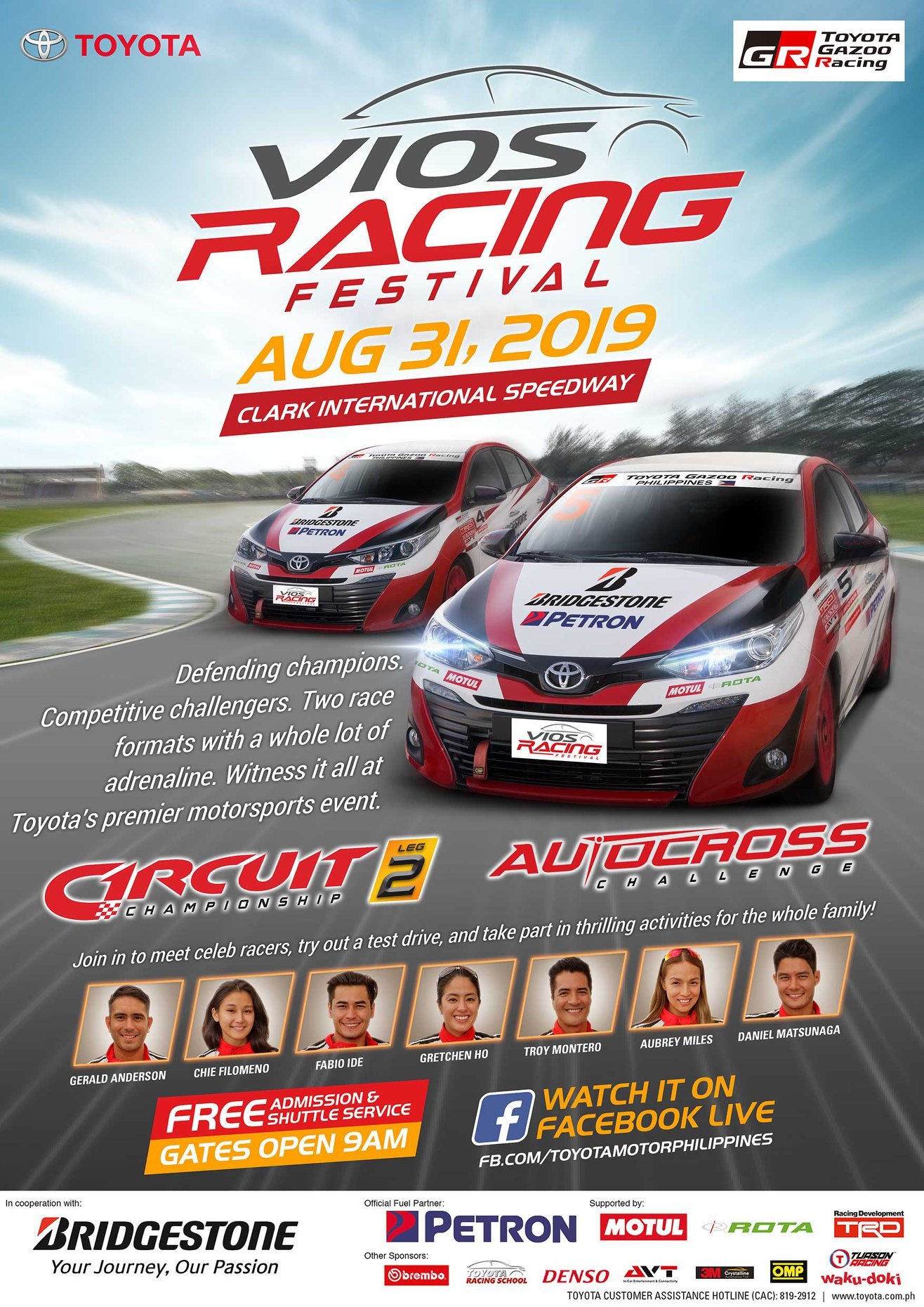 Admission to the event is free, and there will be shuttles available to the general public from SM City Clark going to Clark International Speedway. A host of side events and activities will also be opened for friends and family to enjoy. The Vios Cup races to be held will feature a plethora of celebrities apart from veteran racers. Catch celebrity drivers Gretchen Ho, Chie Filomeno, Fabio Ide, Troy Montero, Aubrey Miles, Daniel Matsunaga, and Gerald Anderson in action as they compete on track using the Vios racecar.