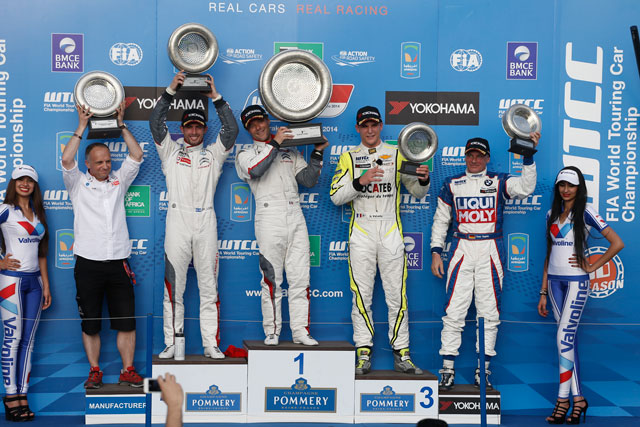 Their teammate, Yvan Muller, placed fifth, despite a third-place finish in Race 1, after he got tangled in a crash at the start of Race 2 involving Mehdi Bennani’s Honda Civic and Tom Coronel’s Chevrolet Cruze and was forced out of the race.